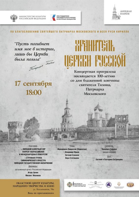17 сентября 2025 года в 18:00 в Областном центре культуры, народного творчества и кино, расположенном по адресу: г. Липецк, ул. Космонавтов, 54а, состоится концерт, посвященный отмечаемому в этом году 100-летию со дня блаженной кончины святителя Тихона, Патриарха Московского. Вход по приглашениям.