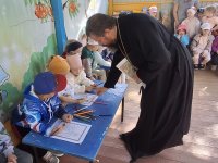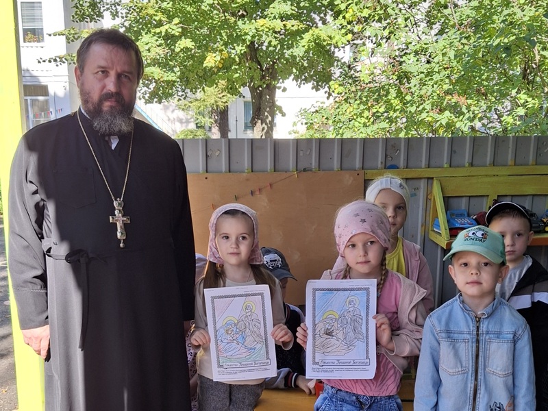Затем дошкольники занялись раскрасками на тему праздника Рождества Пресвятой Богородицы. Встреча проходила на открытом воздухе, где дети с удовольствием выполнили творческое задание.