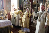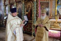 Высокопреосвященнейший Владыка от лица всех собравшихся преподнес в дар отцу-имениннику святую просфору, букет цветов и наперсный крест с украшениями.