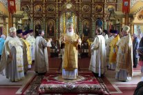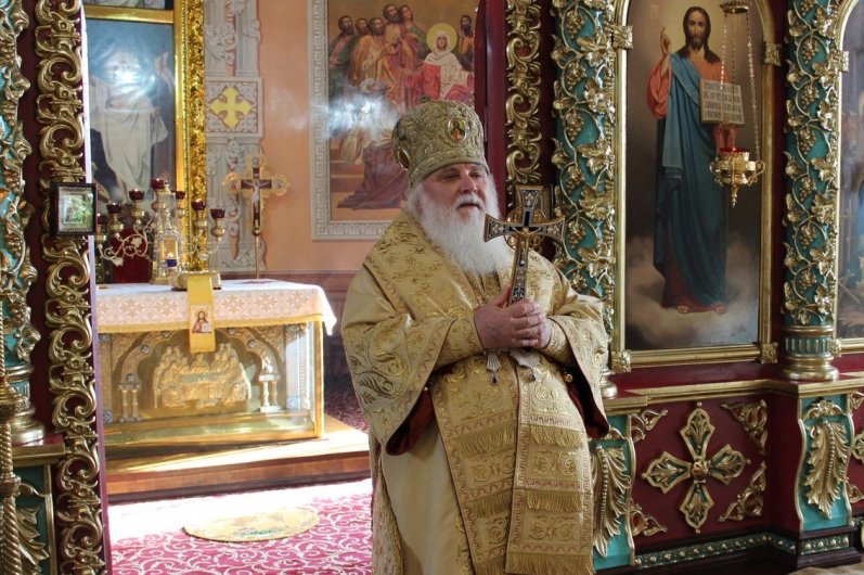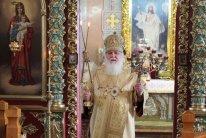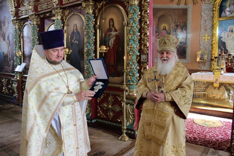 Высокопреосвященнейший Владыка от лица всех собравшихся преподнес в дар отцу-имениннику святую просфору, букет цветов и наперсный крест с украшениями.