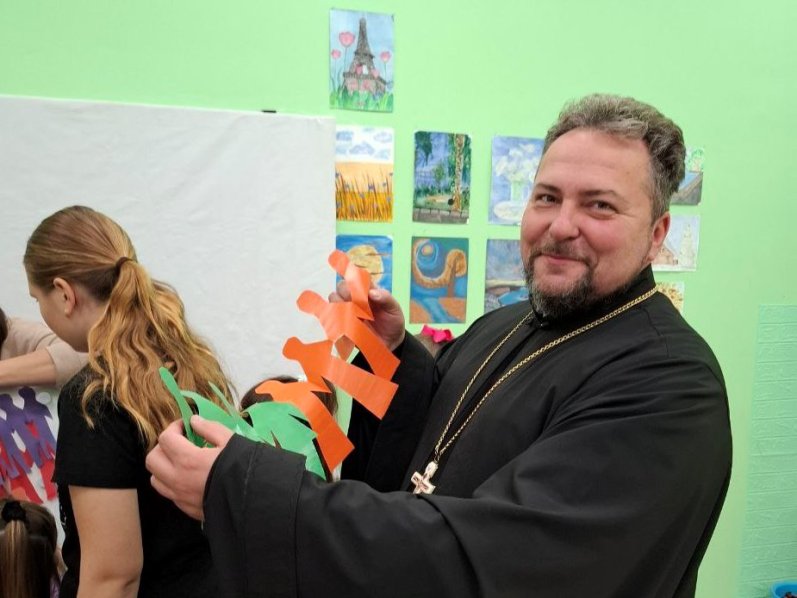 Встреча с детьми проходила в формате историко-познавательной программы «Мы вместе!», над реализацией которой священник работал вместе с сотрудницей Центра Куликовой Светланой Николаевной.