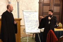 Вопрос о трудностях в работе приходского педагога рассматривался путем работы в командах. В одной из команд оказались представители из Липецка, Воронежа и Подмосковья. С докладом от нашей команды выступил диакон Александр Кадуков вместе со священником из Подмосковья.
