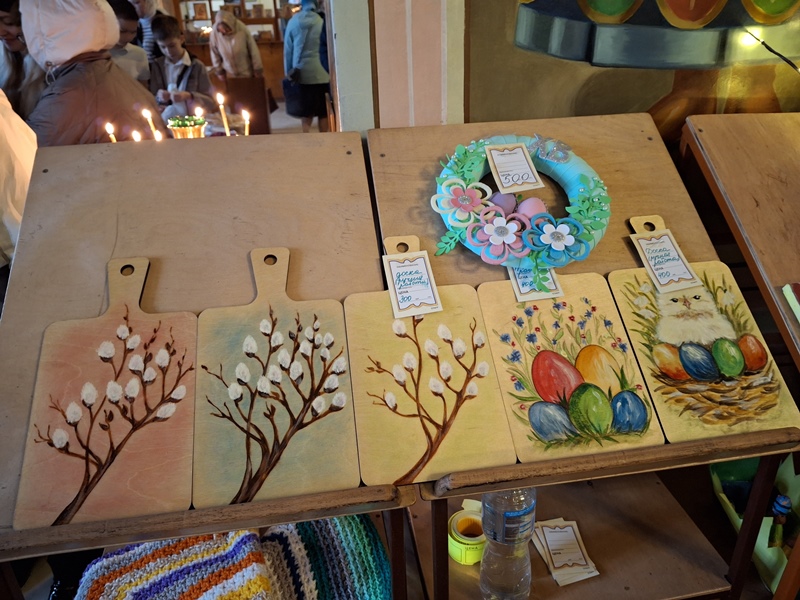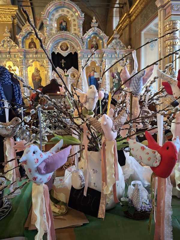 В этот памятный день на прилавках, установленных в трапезной части храма, были представлены различные поделки, рисунки, композиции с цветами и веточками вербы.