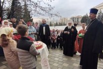 В этот памятный день учащиеся воскресной школы пасхальными приветствиями встретили Высокопреосвященнейшего Арсения, митрополита Липецкого и Задонского. Ребята вручили главе митрополии букет цветов и пасхальные угощения. Встреча с владыкой Арсением произошла перед началом Пасхальной великой вечерни.