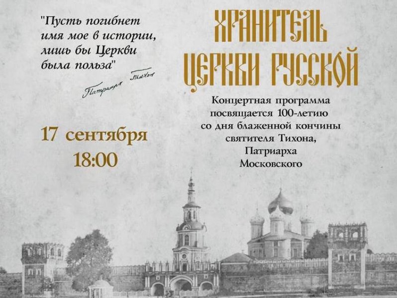 17 сентября 2025 года в 18:00 в Областном центре культуры, народного творчества и кино, расположенном по адресу: г. Липецк, ул. Космонавтов, 54а, состоится концерт, посвященный отмечаемому в этом году 100-летию со дня блаженной кончины святителя Тихона, Патриарха Московского. Вход по приглашениям.